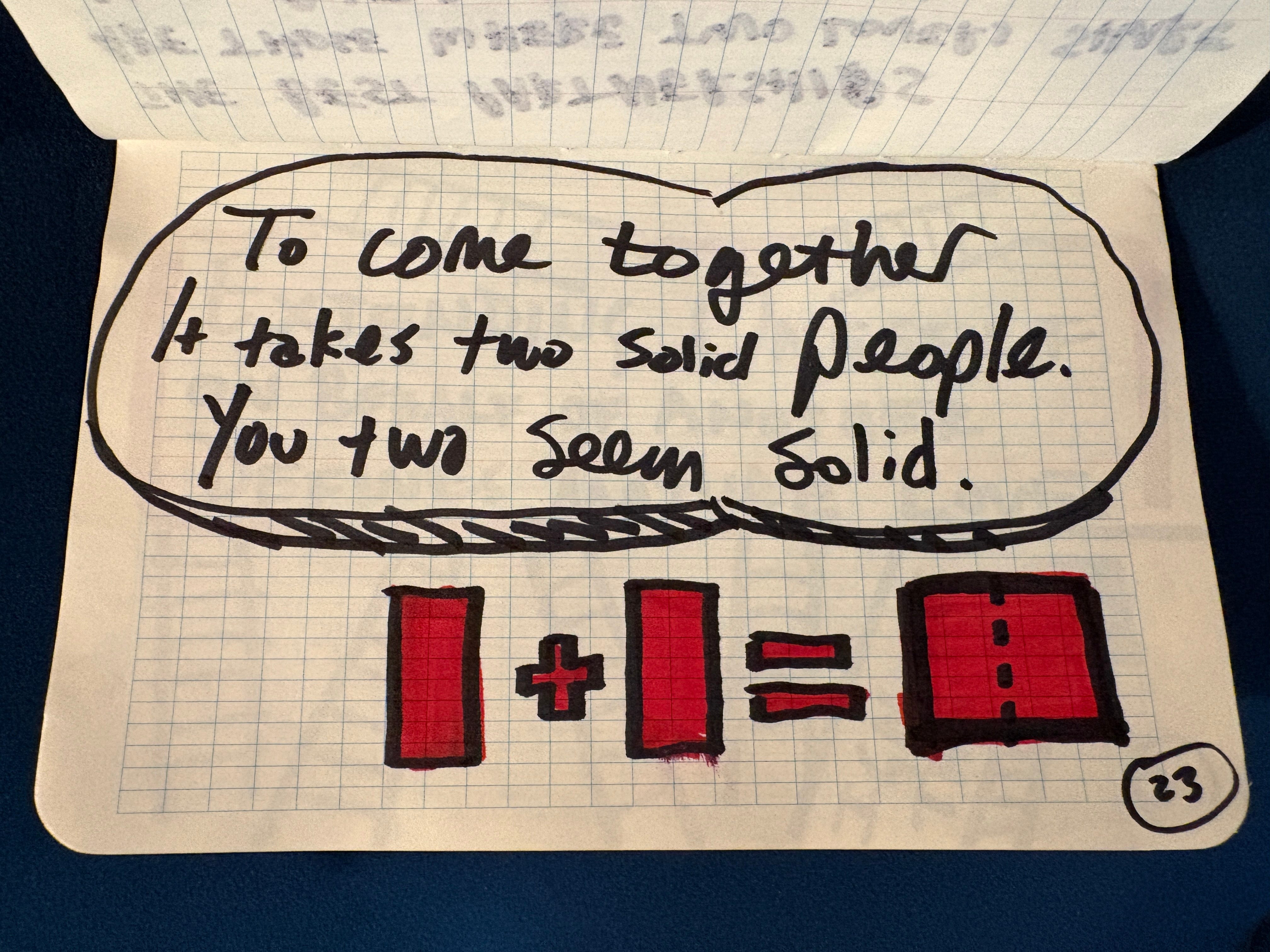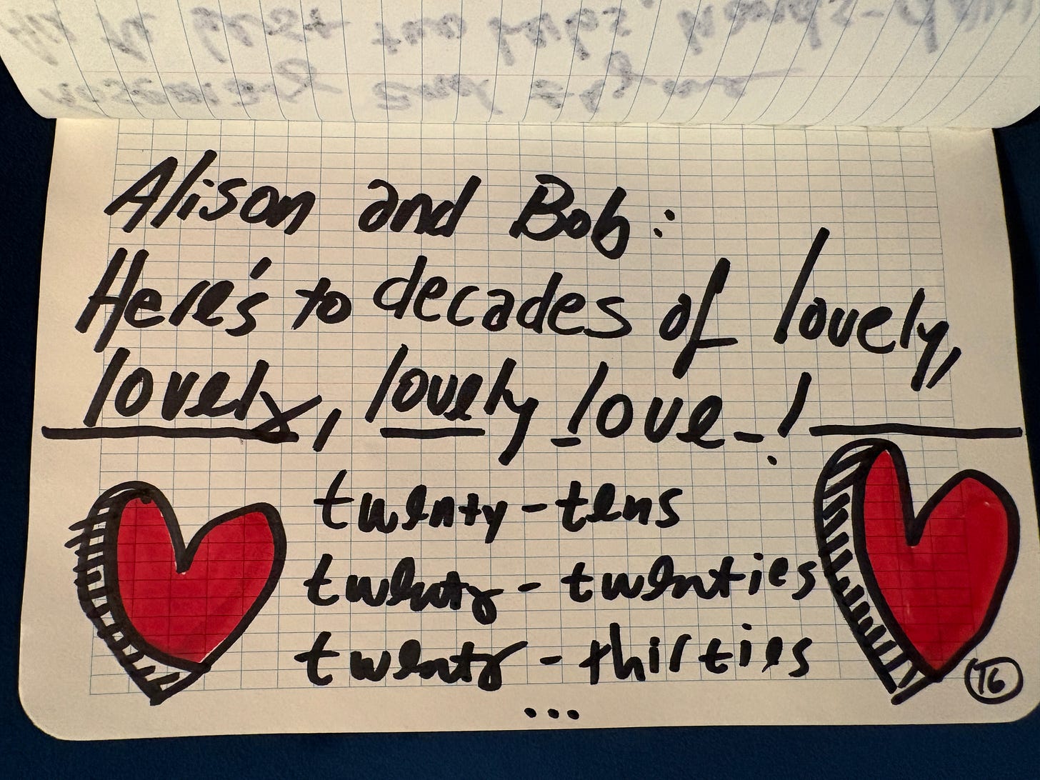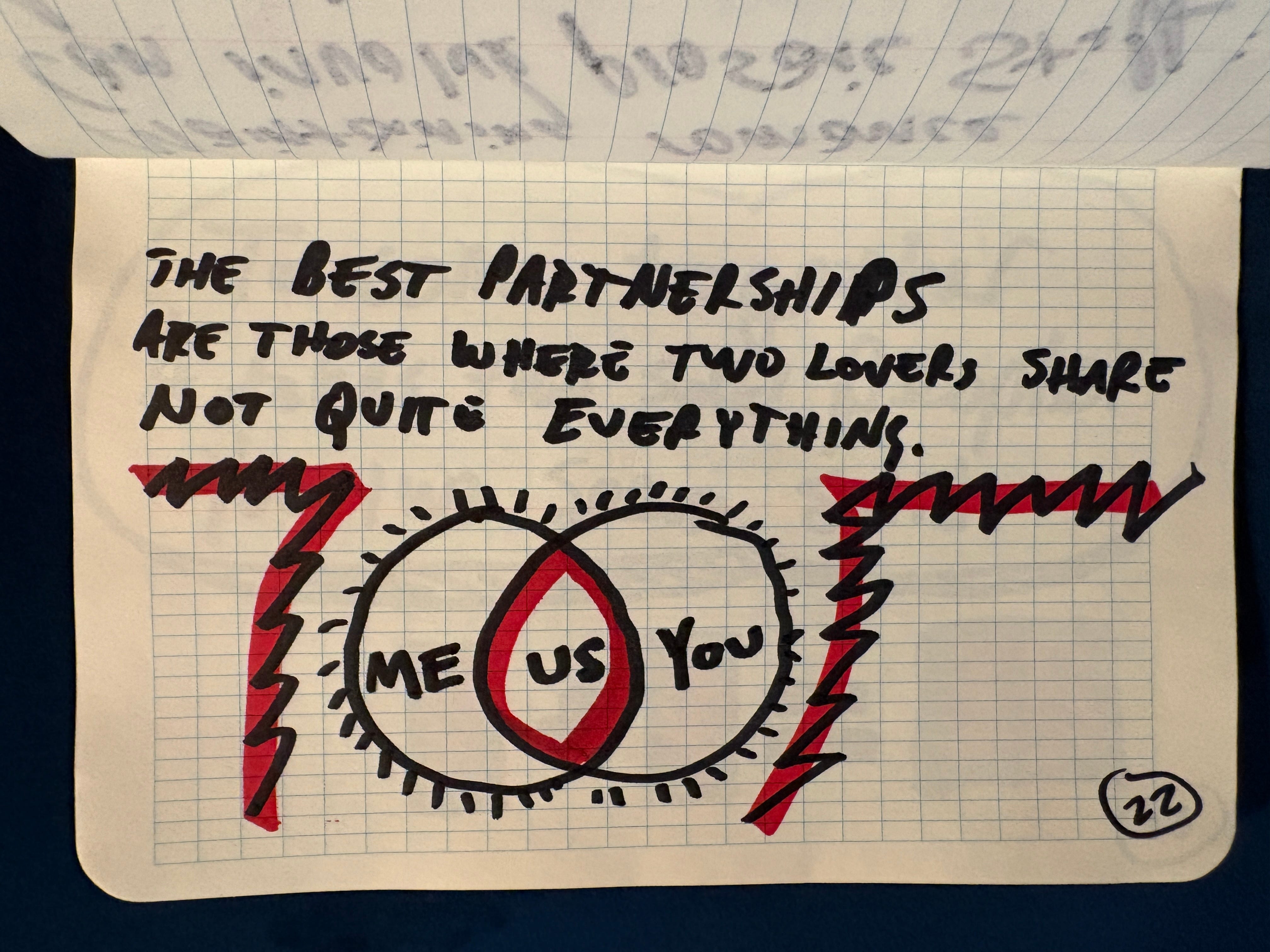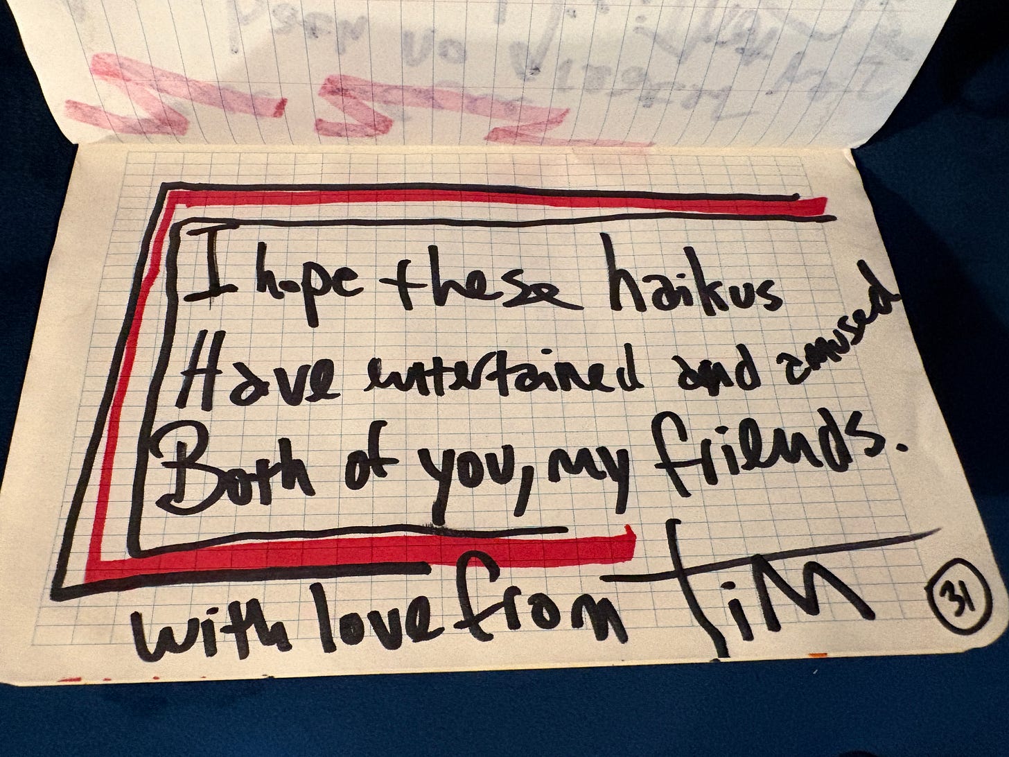 When Alison and I got married, we asked our guests to prepare a haiku to read at the reception. Silly, solemn, whatever. Most people probably agonized to choose the perfect aphorism and shoehorn it into 17 syllables. Tim showed up with a yellow notebook filled with 31 haiku — wise, funny, profound — that he composed in magic marker on the airplane. We regularly quote certain ones to each other. Over the years, they’ve become almost mantras, guiding principles. The yellow notebook is one of our prized possessions.